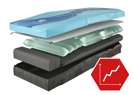 Das Matratzensystem ist aufgrund modernster Sensortechnologie und der Integrationsmöglichkeit in hochwertige und multifunktionale Intensivbetten die perfekte Lösung für Intensivstationen. Durch konstanten Niedrigdruck (CLP) wird ein durchgehend gutes Niveau der Druckverteilung erreicht.